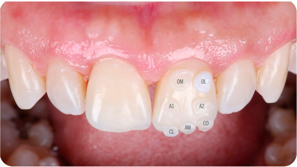 Foi realizado uma seleção de cor com as cores de resinas (Charisma® Diamond) que mais se aproximavam do remanescente dental: OM e OL – Região Cervical; A1 e A2 – Terço Médio; CL, AM e CO – Incisal.