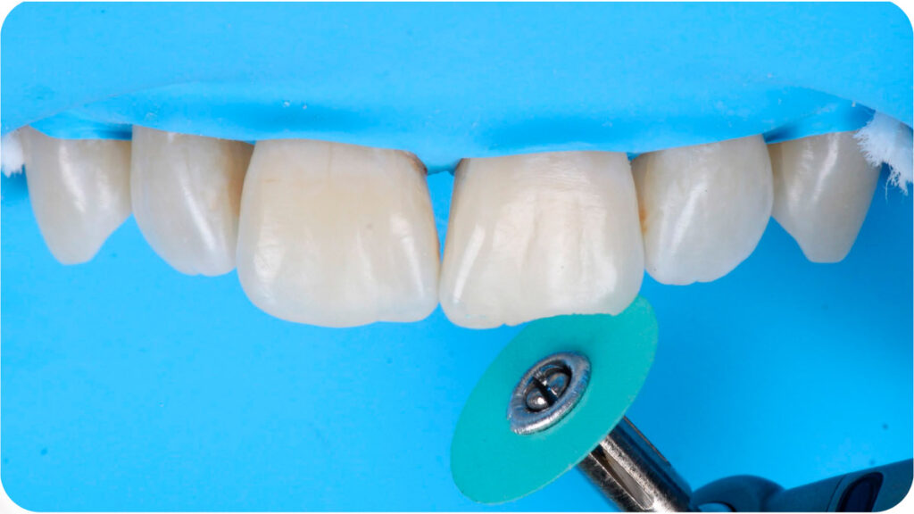 O polimento final foi realizado na mesma consulta, utilizando principalmente discos abrasivos, brocas carbides e borrachas de polimento.