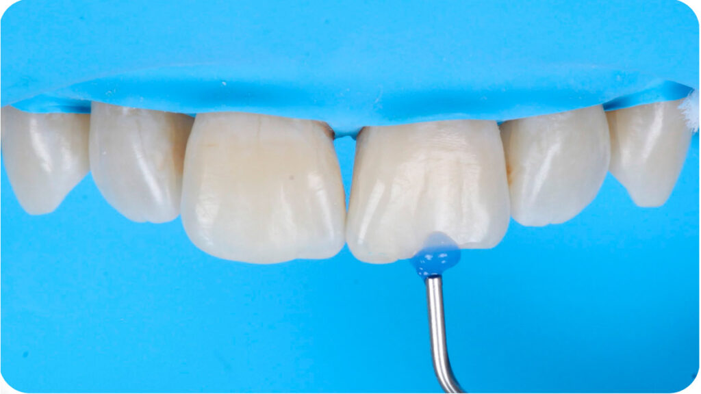 Foi realizado um isolamento absoluto para controle dos fluídos e um bisel com discos abrasivos no remanescente dentário para melhor acomodação da resina composta.