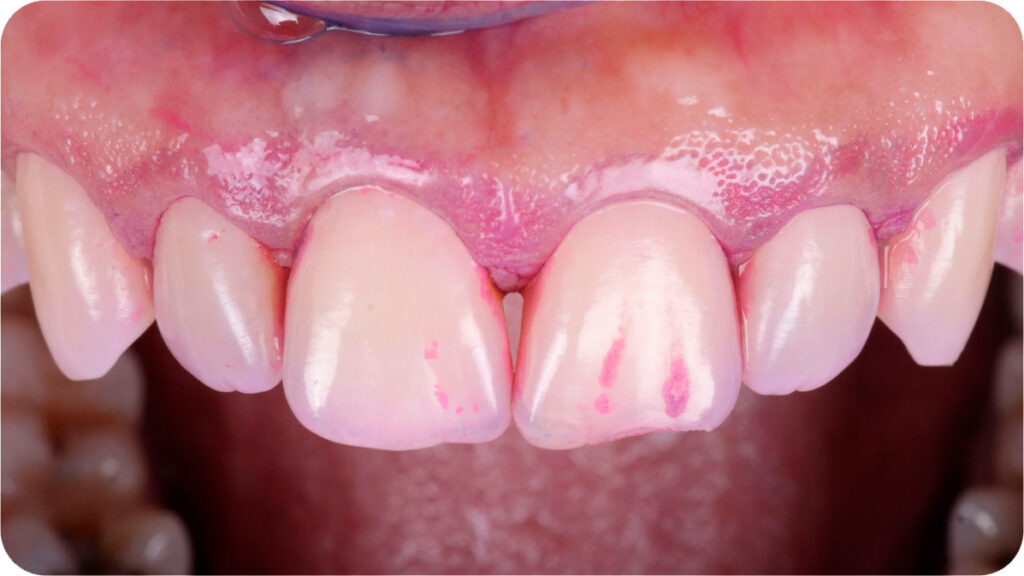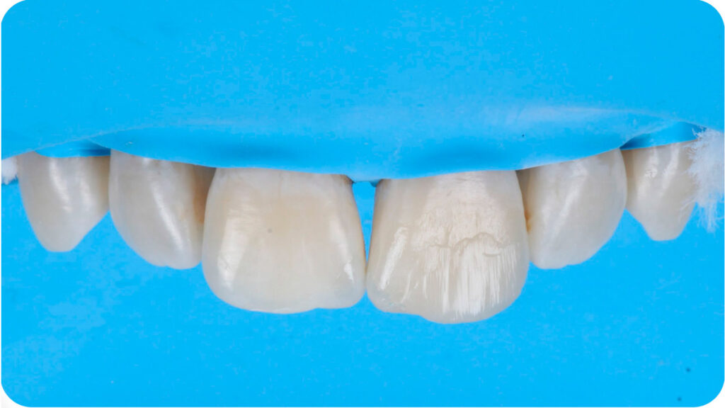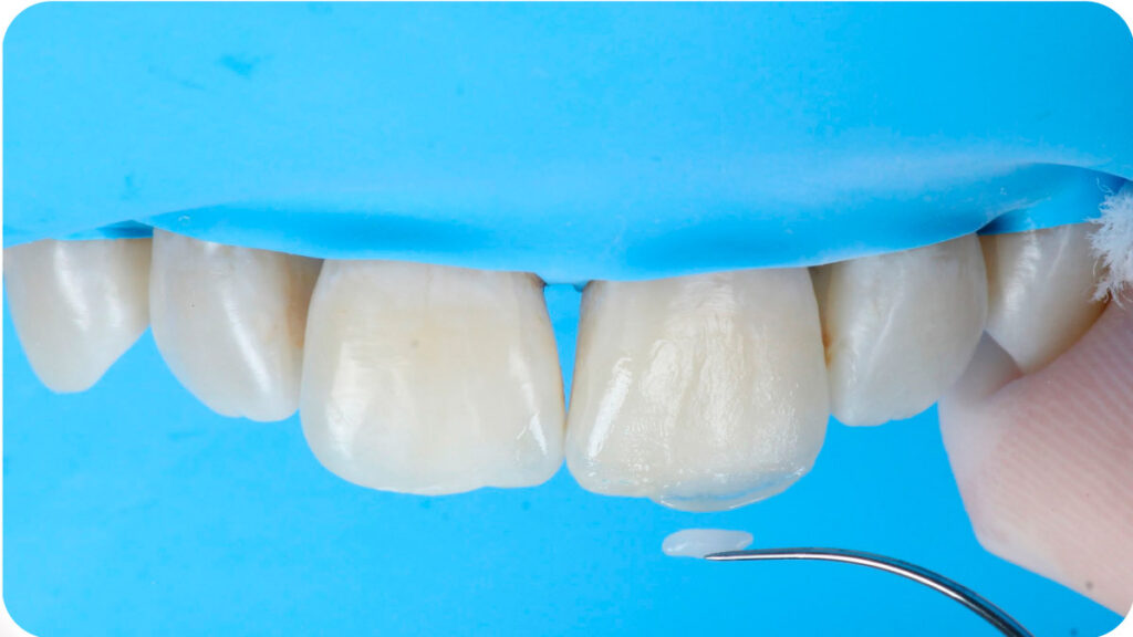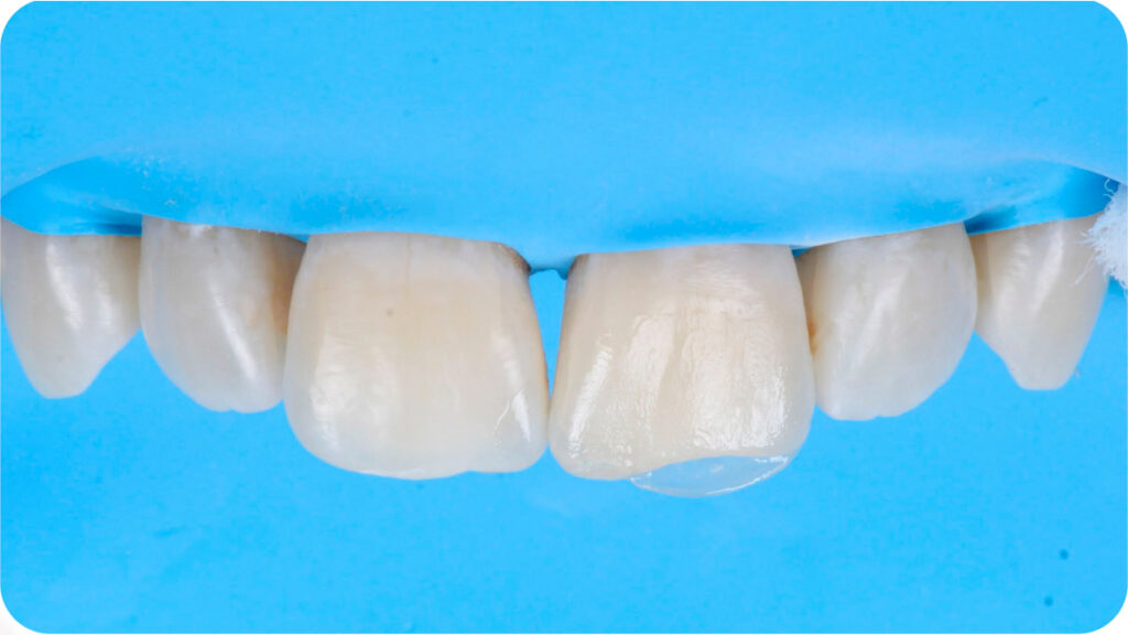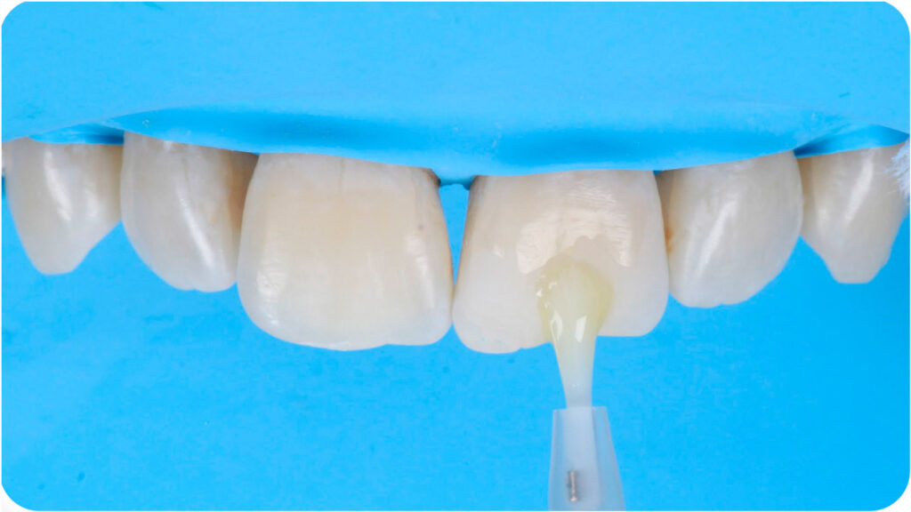 Após isolamento absoluto, foi realizado um condicionamento ácido e aplicação do sistema adesivo (GLUMA® Bond5 – Kulzer), protegendo os dentes adjacentes e respeitando o tempo e aplicação de cada material. Abaixo, aplicação do GLUMA® Etch 35% – Kulzer