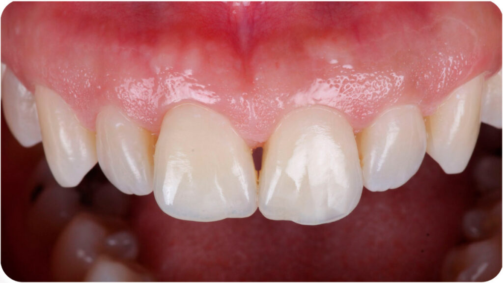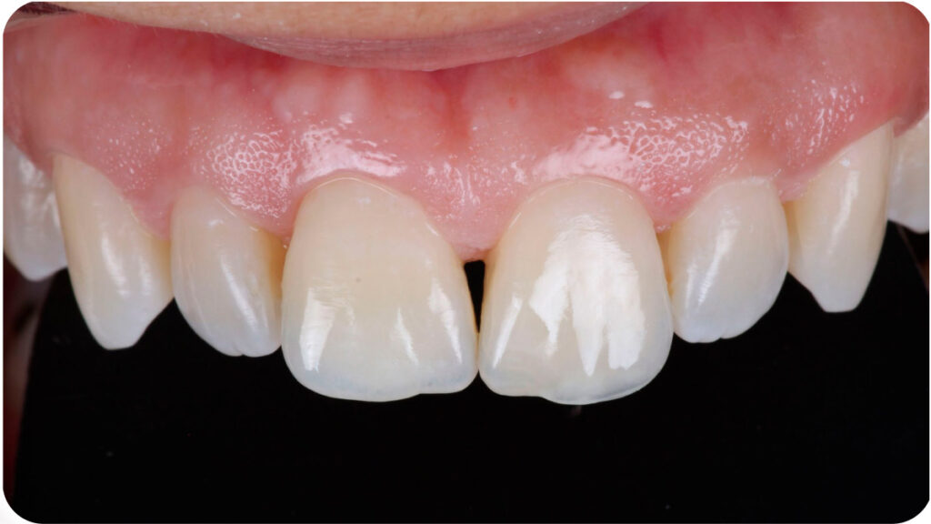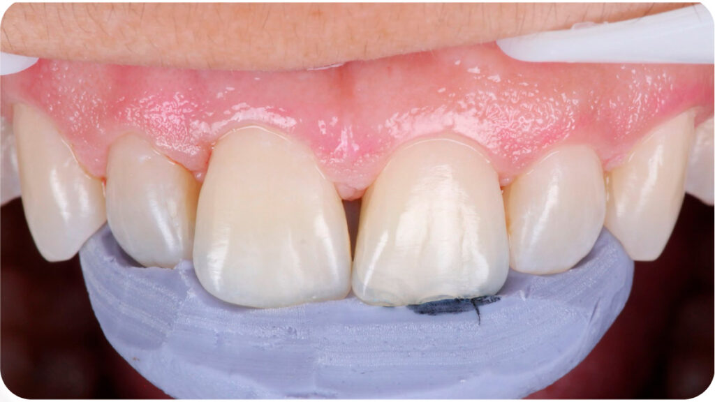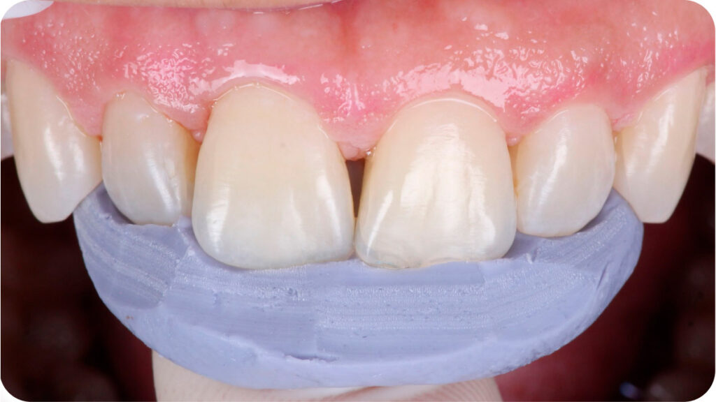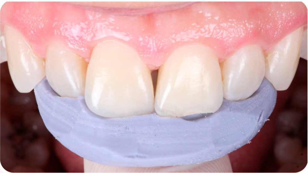 Previamente, foi realizado a moldagem palatina dos dentes com Variotime® Easy Putty (Kulzer), delimitado o formato mais próximo do dente adjacente e a personalização da matriz palatina com broca carbide. Abaixo, posicionamento da matriz na palatina: